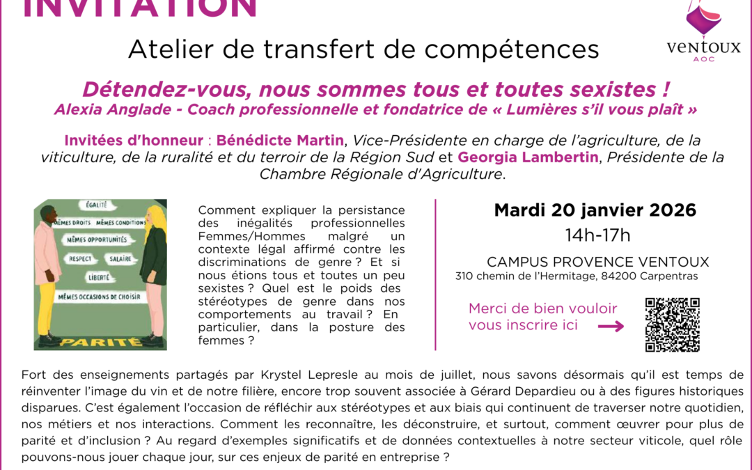 Dans le cadre de la raison d'être de l'AOC Ventoux, nous organisons le 8ème atelier "transfert de compétences" le mardi 20 janvier après-midi au Campus Provence Ventoux de Carpentras, sur le thème du sexisme et de la parité. Il sera ouvert par nos deux invitées d'honneur : Bénédicte Martin, Vice-Présidente de la Région Sud, en charge de la viticulture et Georgia Lambertin, Présidente de la Chambre d'Agriculture Régionale. Alexia Anglade, qui est intervenue dans le Ventoux en 2025 pour des formations de leadership au féminin sera présente pour animer la conférence « Détendez-vous, nous sommes tous et toutes sexistes ».